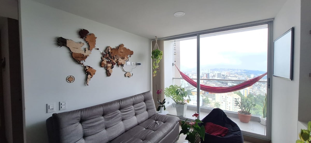 Strategically located! Comfortable apartment with a private patio and an amazing view. 2 bedrooms, 2 beds & One bathroom. Max capacity of 4 people. Table games are available. Highspeed internet 350 Mbps, Netflix & Youtube. Steps from the Santander Av. & Paralela Av., from Universities (Autonoma, Catolica, Caldas, Nacional). Steps from the Hospital Infantil & Caldas). Walk to the vibrant area of El Cable and Cerro de Oro. Easy access to public transportation steps from the property.