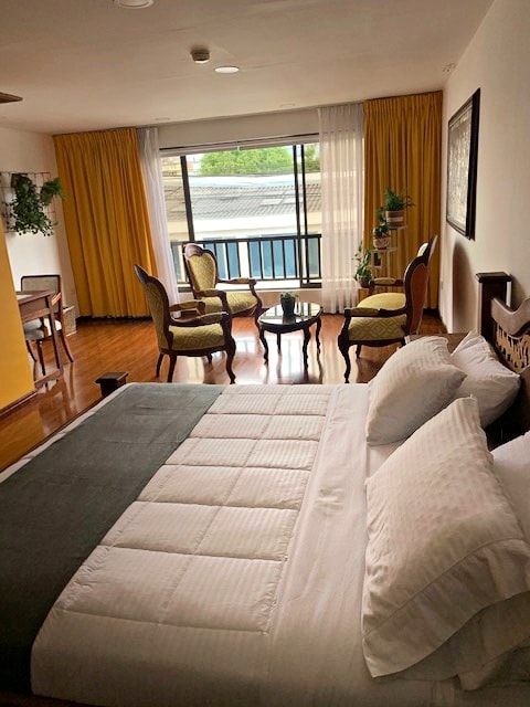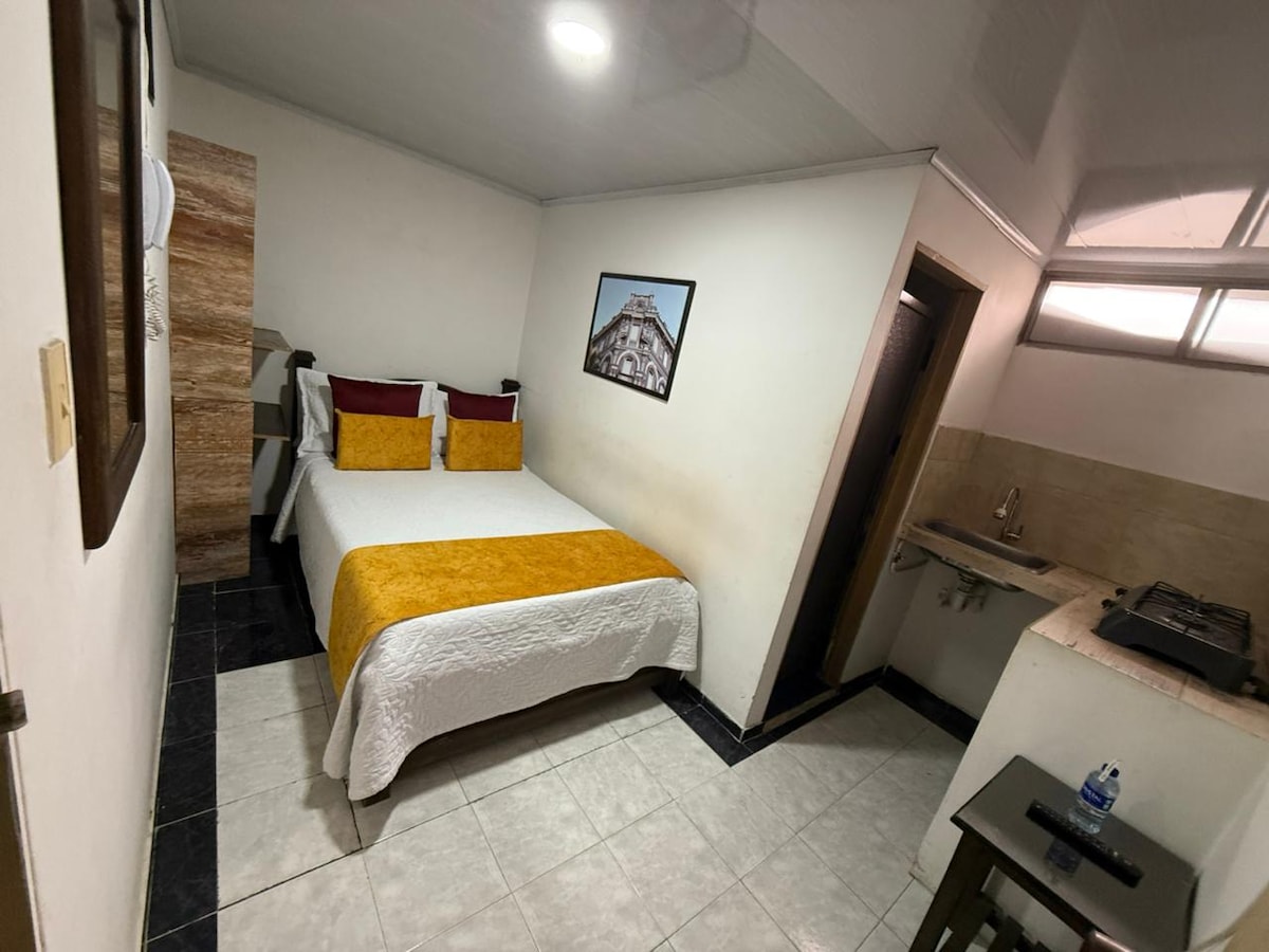 Apartaestudio independiente Consta de 2 dormitorios con puerta cada uno con 2 camas semidobles con ventana a la calle. Cuenta con lencería, mesa pequeña de noche, baño privado con agua caliente, nevera y cocineta (se habilita, para estancias mayores a 15 días), guarda ropa, servicio de wifi, parabólica, TV por. Servicio de recepción y vigilancia las 24 horas room service matutino, botella de agua. servicio de mensualidad con descuento, para corporativos, estudiantes y afines.