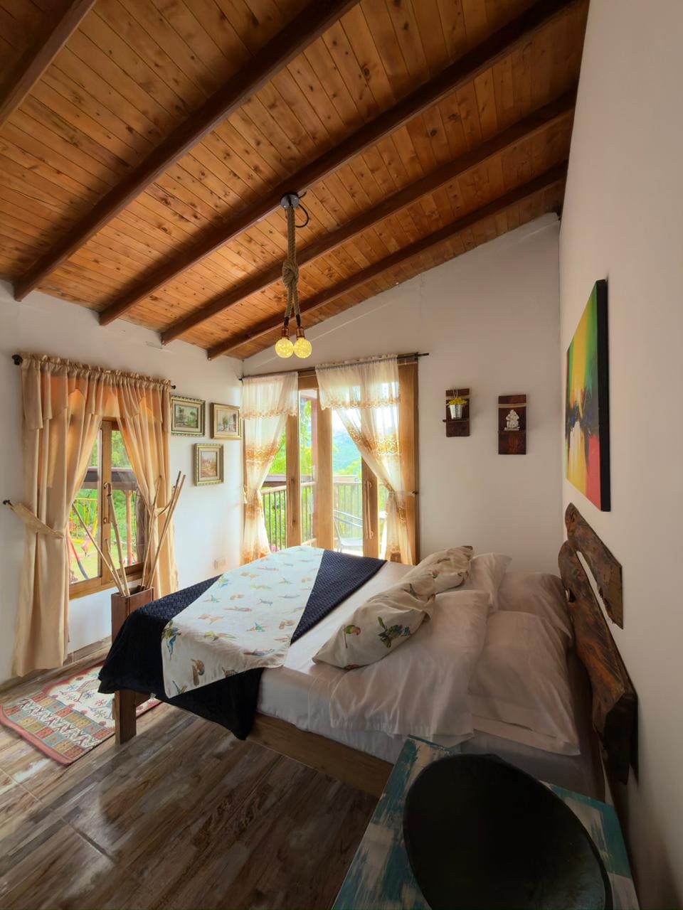 Vive la esencia de México en el Eje Cafetero. La cabaña Raíces Mexicanas combina colores vibrantes y artesanías con el confort de un jacuzzi privado y vista panorámica. Cuenta con cama doble, baño privado, balcón y ambiente acogedor. Disfruta de nuestro restaurante, fogatas, senderos, yoga y actividades culturales. Ideal para parejas que buscan romanticismo, cultura y naturaleza cerca de Manizales.