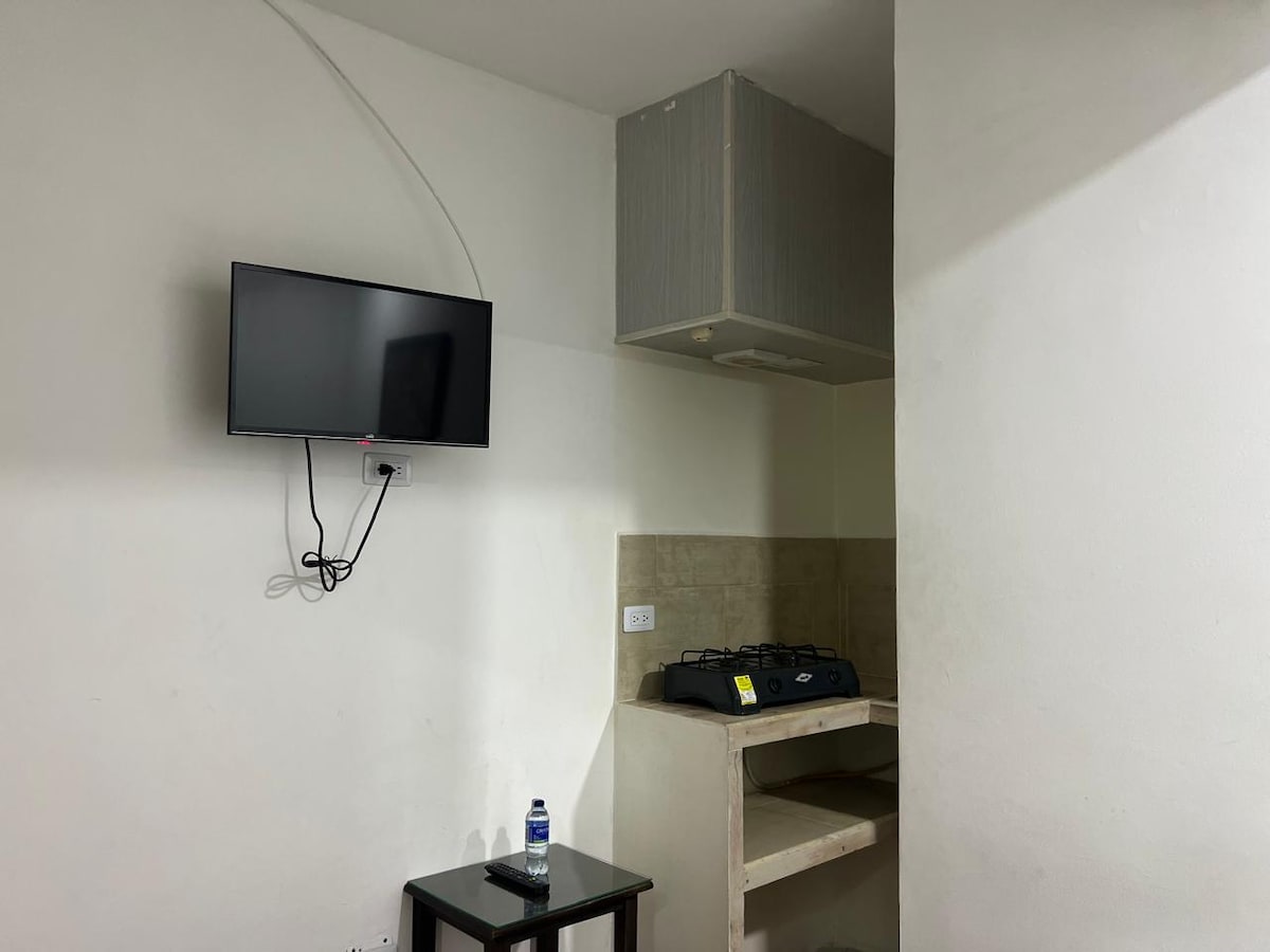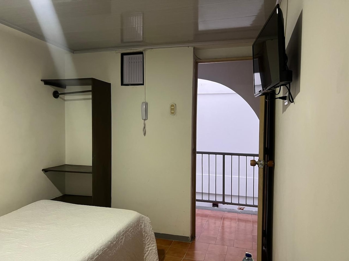 Habitación tipo loft independiente con una cama semidoble, ideal para una persona o una pareja, cuenta con lencería, mesa pequeña de noche, baño privado con agua caliente, cocineta, nevera ( para estadías mayores a 15 días), servicio de wifi, parabólica y tv, Servicio de recepción y vigilancia las 24 horas. rom service matutino, botella de agua. servicio de mensualidad con descuento, para corporativos, estudiantes y afines.