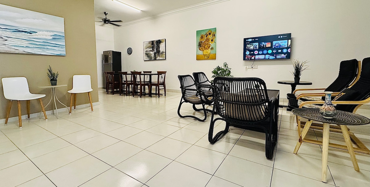 Suria Homestay comprises a spacious living & dining area downstairs and 3 bedrooms upstairs, each with its own air conditioning & attached bathroom. Facilities & Amenities for 8 guests * Auto gate * Lockbox for keys * 2 carparks * 1 queen size bed * 6 single bed * Hot water heater & bidet * Sofa set * 50” smart TV * Wi-Fi * Dining tables & chairs * Refrigerator * Microwave oven * Coway mineral water dispenser * Kettle * Cups, plates, cutlery * Washing machine * Iron * Hairdryer * Mirror