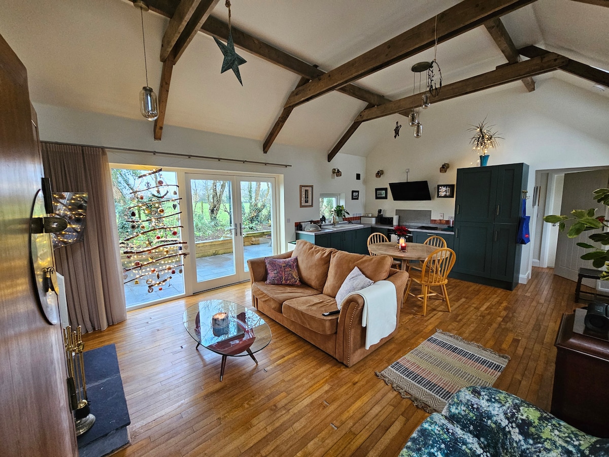 This is recent modern Barn conversion. (Jan 2015) It contains one large kitchen/dining/lounge area, one double bedroom with en suite facilities. June 2017 added second Living Space area with view of adjacent farm and wood, Lobby area with Laundry facilities and a second bathroom. Please note the Grounds and external outdoor perimeter of The Barn is protected by CCTV TK Alarm Company. Please know this is a simple place. It once was out buildings, however you will find it warm and homely.