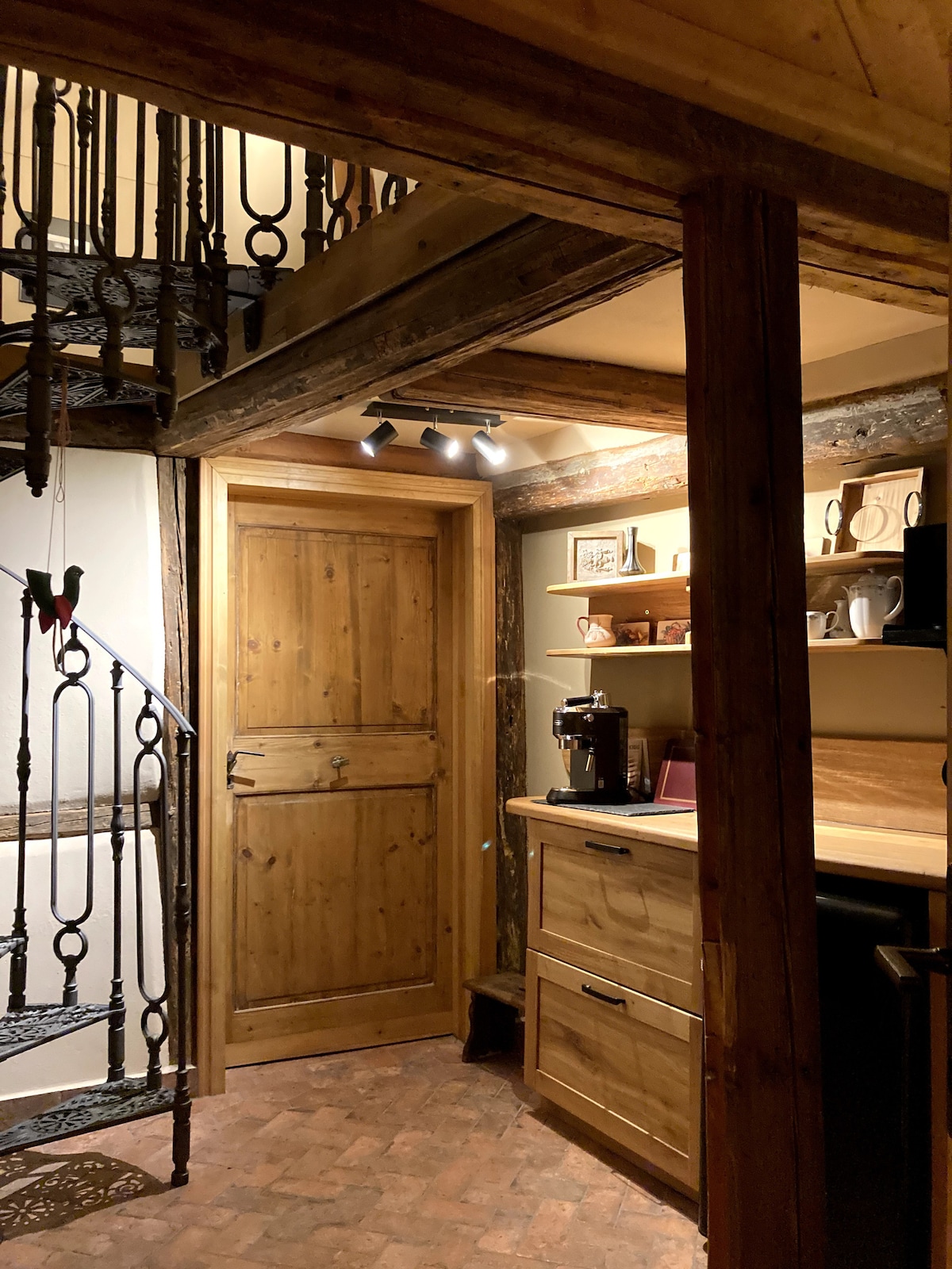 Welcome to our romantic holiday apartment in the heart of Quedlinburg’s World Heritage Site. The apartment spans two floors in a carefully restored 17th-century half-timbered house. Many original beams, walls, and historic doors have been preserved inside. A cast-iron spiral staircase leads to the attic. The interior has been lovingly designed, partly with historical furniture and partly with unique pieces crafted by a carpenter.
