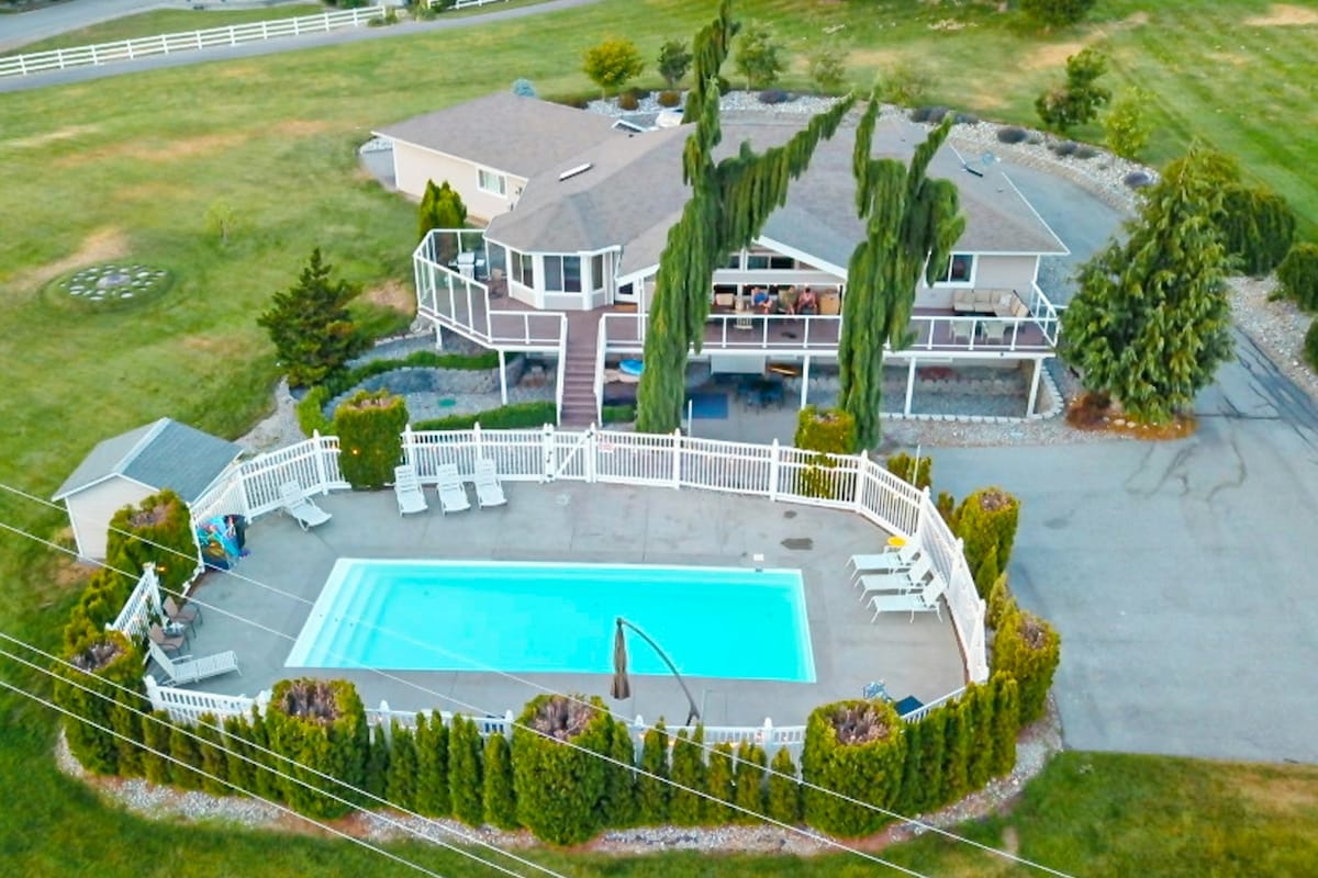 Treat your family or group to panoramic lake views at this Lake Chelan luxury retreat. This charming home has been freshly renovated with a sophisticated blend of modern and farmhouse designs. Relax to a mood-setting electric fireplace in the main living area, a bonus room downstairs that is perfect for movie or game nights & covered deck so you can relax and BBQ in style! Over half an acre of tranquil, park-like grounds including a fenced-in yard, a private 44' heated pool, cabana & hot tub!