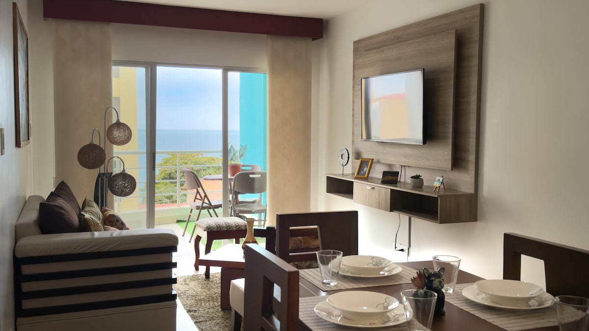 Modern apartment with ocean views, steps from El Murciélago Beach (venue for Ironman 70.3), Mall del Pacífico, and top local restaurants. Perfect for vacation/remote work with a monitor provided. Quiet, away from street noise. 24/7 security and high-speed fiber optic internet. Amenities include a pool, sauna, and jacuzzi (open Tue-Sun, it may change without notice). The building has a generator for common areas, and a UPS keeps the WiFi running. Elevator, water, and internet work during outages.