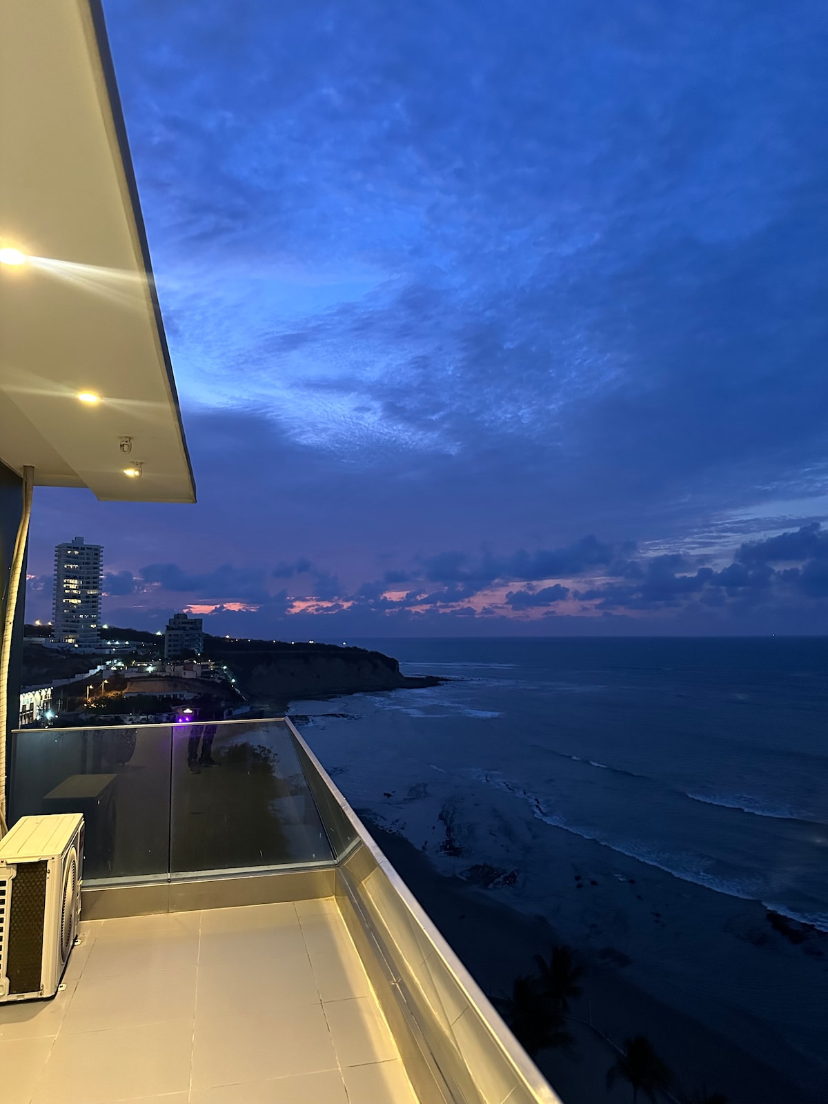 Welcome to our oceanfront paradise in Playa Murciélago, Manta. Enjoy an unforgettable stay in a spacious 3-bedroom, 3-bathroom apartment. The master bedroom has a private bathroom and ocean views; the other two bedrooms have air conditioning and city views. The building is secure, with 24/7 security, cameras, accessible access, an elevator, and 2 large parking spaces. Relax in the living room and kitchen with ocean views, or sip a coffee on the balcony. WE'LL BE WAITING FOR YOU!