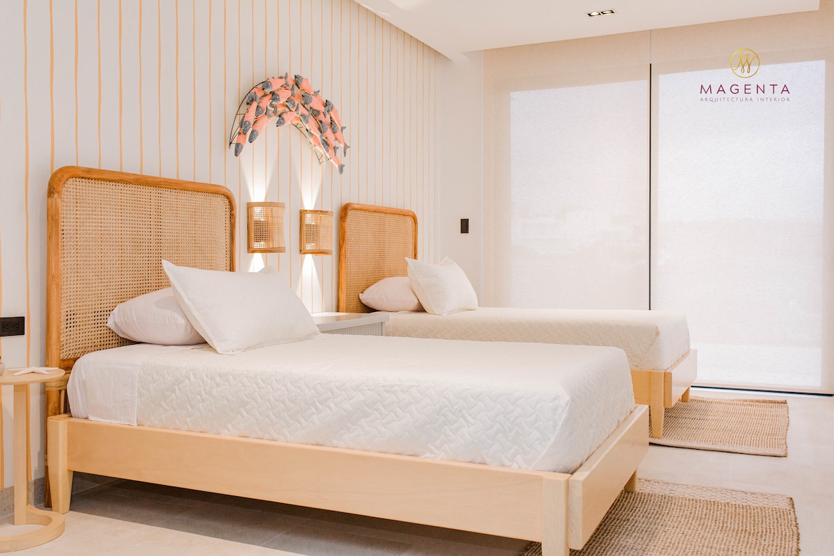 Enjoy a comfortable stay in this fully equipped 2 bed, 2 bath apartment, ideal for families or small groups. It has a queen bed, 2 full beds, 1 sofa bed, 2 modern bathrooms, kitchen equipped with American bar, stove, microwave, big fridge, closets, high-speed WiFi, 4K Smart TV and private parking AMENITIES COMPARTIDOS Full access to the Rooftop, pool, jacuzzi, fire pit and bbq overlooking the ocean.