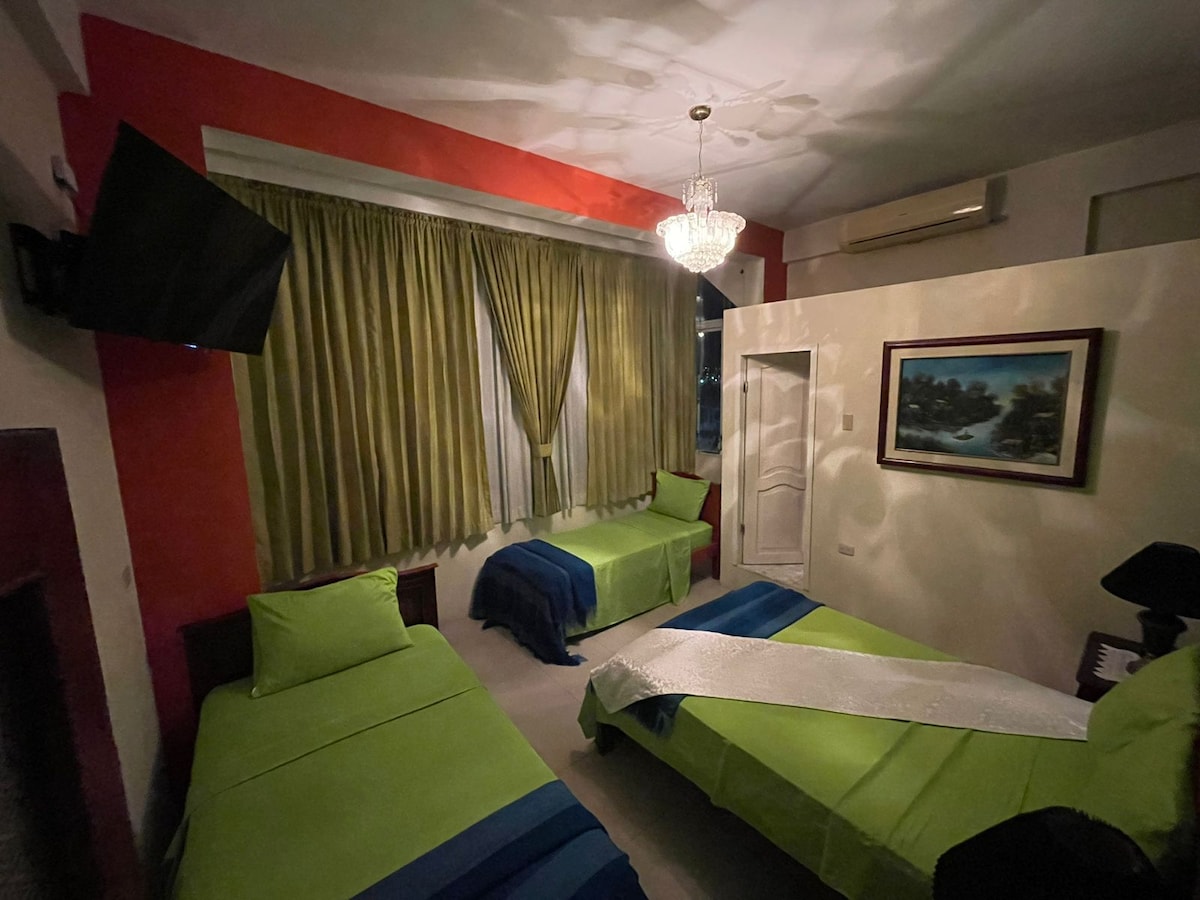Esta mini-suite acomoda de uno a tres huéspedes, con amplitud de espacio. Tiene una cama matrimonial y una individual. Es perfecta para viajeros solos o acompañados. Esta suite es parte de un conjunto de mini suites privadas para huéspedes. Queda en el segundo piso de una casa privada, y con seguridad, convenientemente localizada en uno de los barrios premier de Manta, a pocos pasos de la zona rosa, restaurantes y bares. Y también lo suficiente residencial para proveer tranquilidad y silencio.