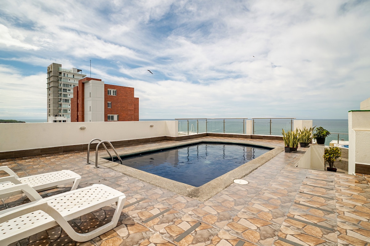 Beautiful and elegant two-bedroom apartment with ocean views, just a couple of blocks from Manta's nightlife distric Relaxing spaces with excellent natural light and a functional layout that makes the most of every inch. It features a cozy living room, an integrated dining area, and a modern kitchen. The bedrooms are spacious and airy, ideal for relaxing or converting into a study/office. The building offers an infinity pool, jacuzzi, and communal areas including a BBQ, fire pit, and more.