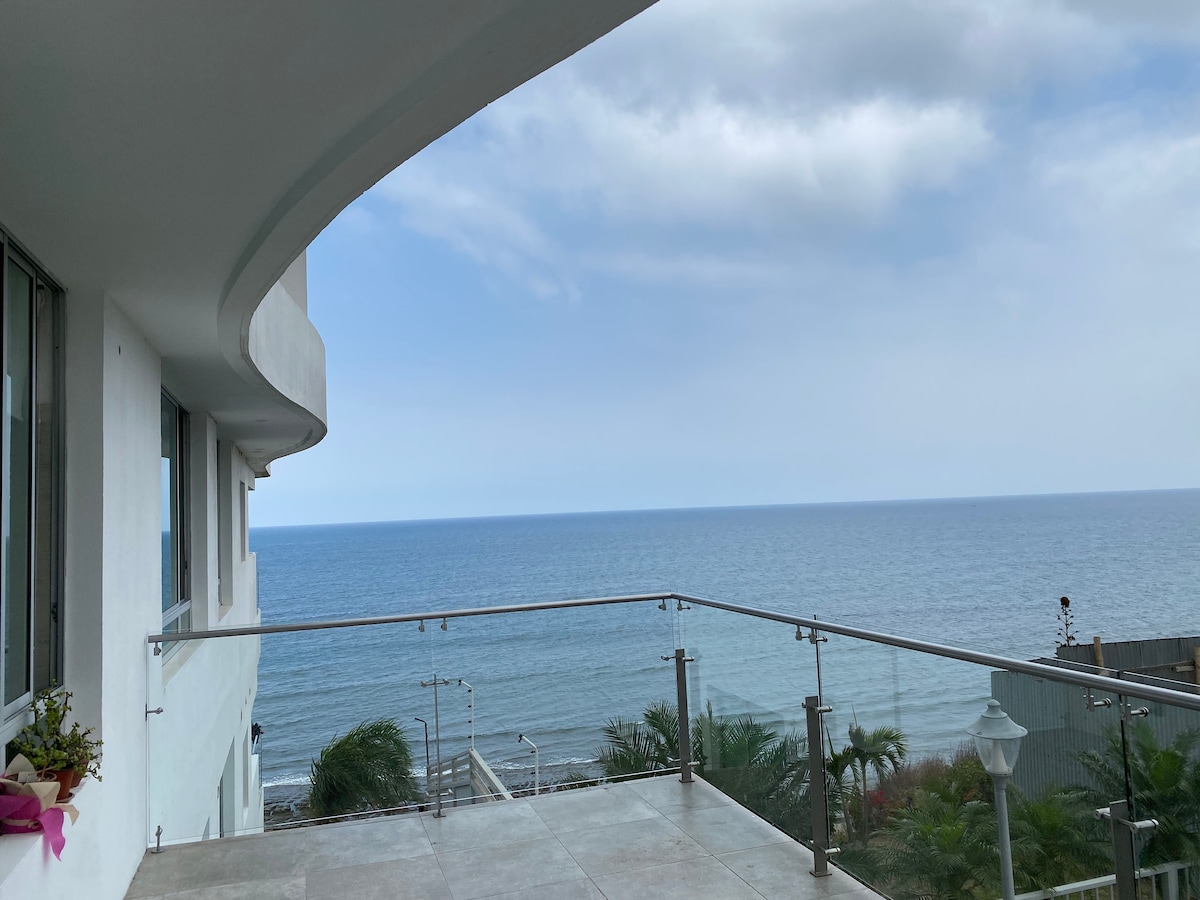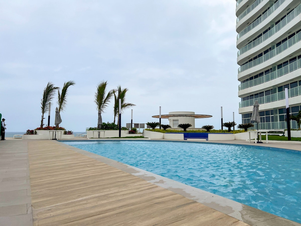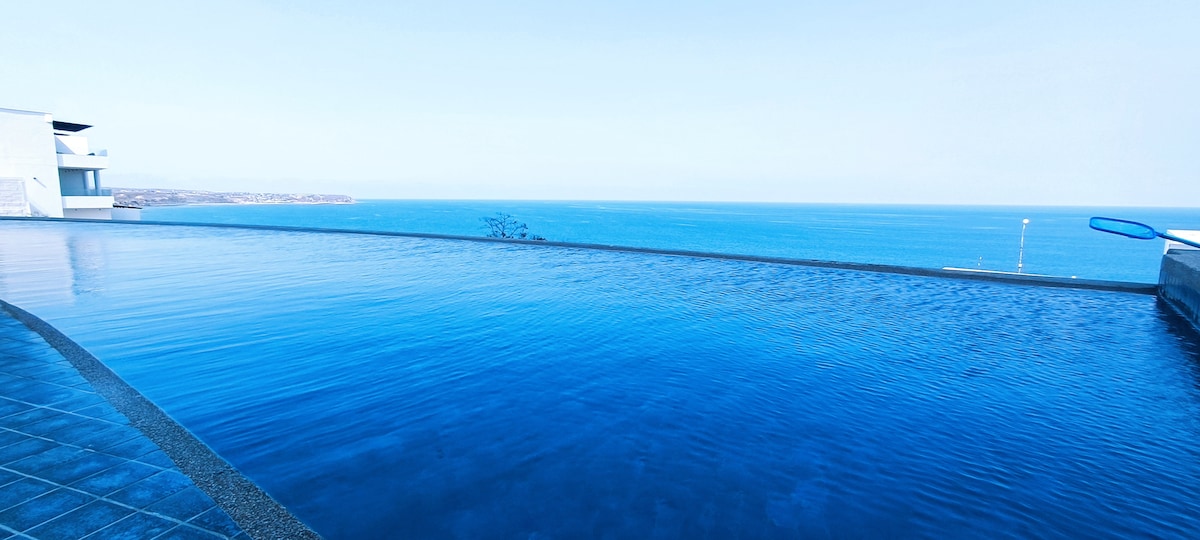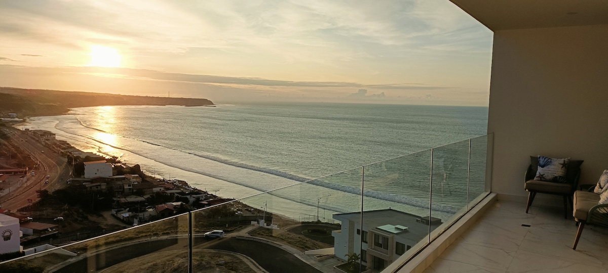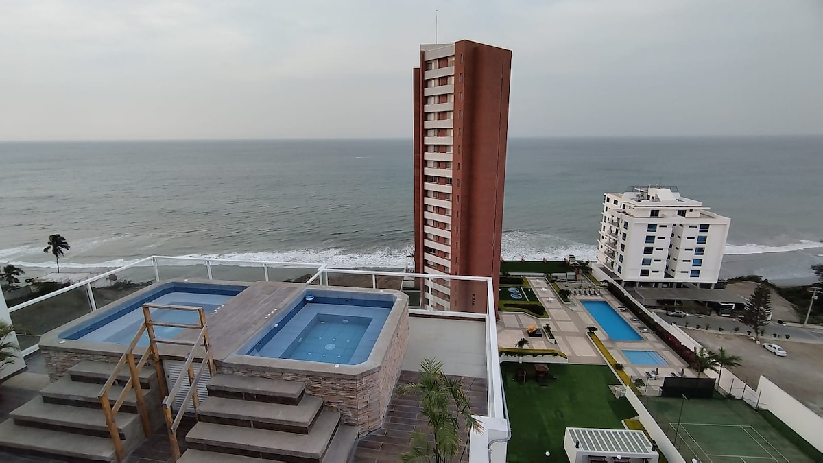 Brand new unit on the 17th floor of one of the tallest buildings in Manta. Breathtaking views of the ocean and city. This oasis is modern and welcoming. Just a stroll from restaurants, markets, and the best nightlife in Manta. This elegant condo comes equipped with a modern kitchen and custom bathroom showers. This beautiful stay awaits you! Three pools, gym, and hot tube. Security guard on duty 24hr. Kids playground 🛝