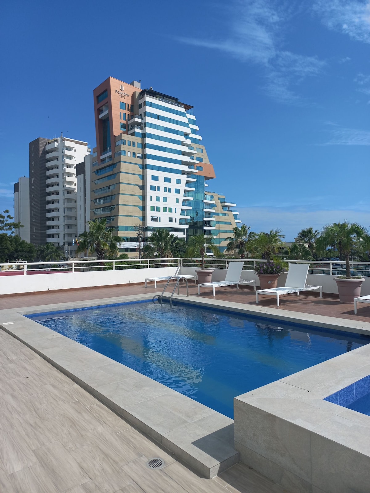 Moderno y exclusivo apartamento en el hotel 5 estrellas POSEIDON, en la mejor zona de Manta. Apartamento con capacidad máxima para 7 personas. Por la ubicación del apartamento en el piso 8, este cuenta con la salida directa al solárium del edificio desde donde se aprecia una vista al mar espectacular, mientras que desde el interior del apartamento disfrutas de la vista hacia la ciudad .