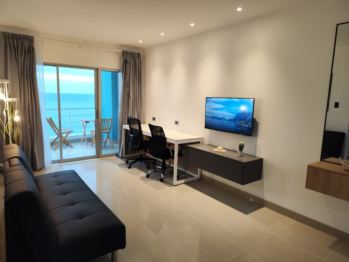 Modern apartment with ocean views, steps from El Murciélago Beach (venue for Ironman 70.3), Mall del Pacífico, and top local restaurants. Perfect for vacation/remote work with a monitor provided. Quiet, away from street noise. 24/7 security and high-speed fiber optic internet. Amenities include a pool, sauna, and jacuzzi (open Tue-Sun, it may change without notice). The building has a generator for common areas, and a UPS keeps the WiFi running. Elevator, water, and internet work during outages.