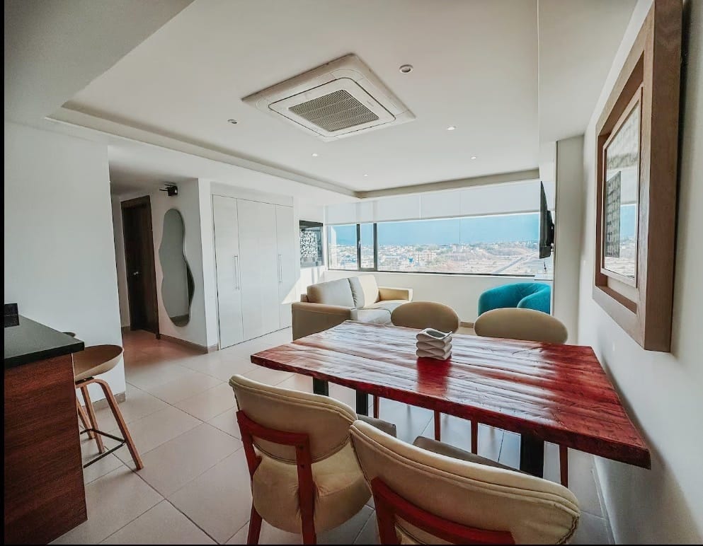 Moderno departamento frente al mar en Manta. Cuenta con 2 habitaciones (1 cama doble y 2 individuales), 2 baños completos, cocina equipada, agua potable y filtro de agua, WiFi y aire acondicionado. Acceso directo a la playa, vista al océano y seguridad 24/7. Junto al Mall del Pacífico, cerca de restaurantes y a 10 min del aeropuerto. Ideal para familias, amigos o trabajo. ¡Disfruta atardeceres únicos!