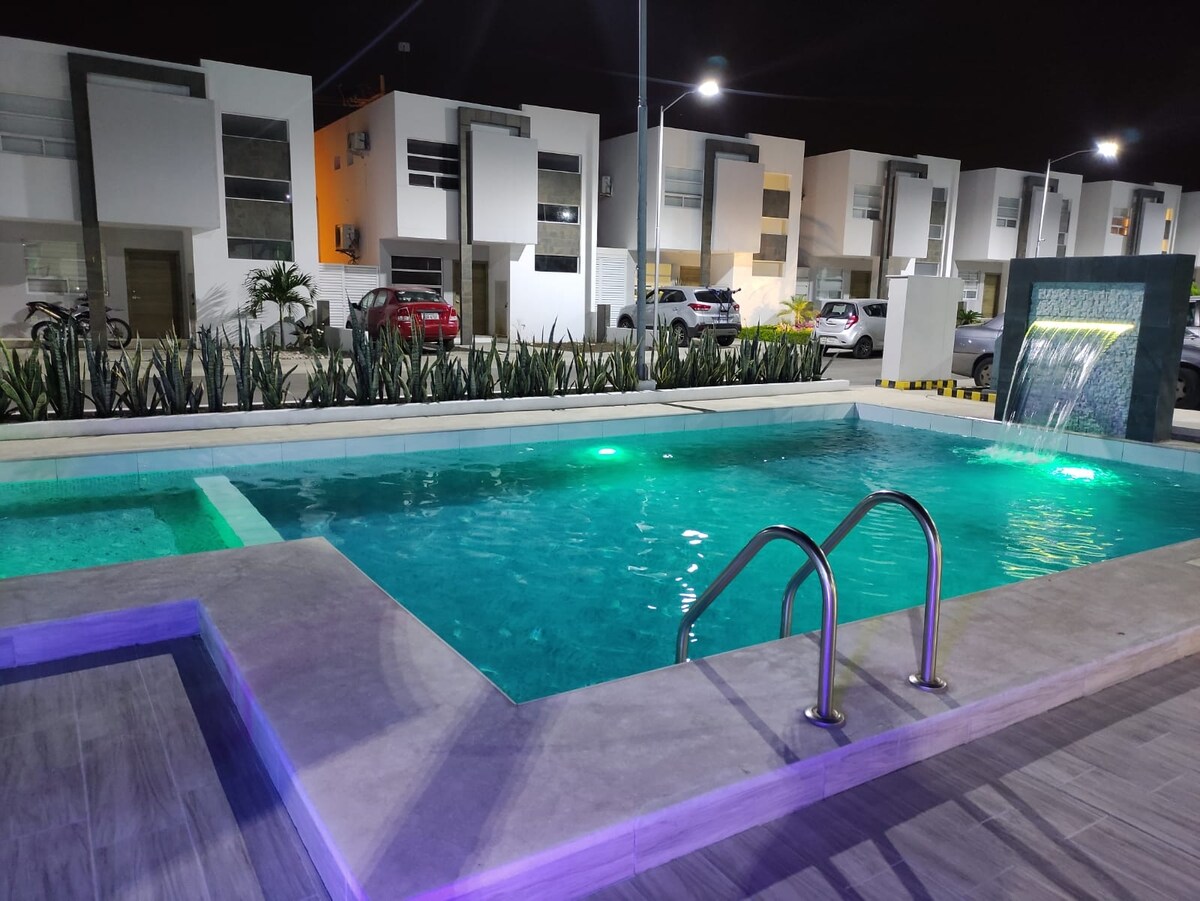 Enjoy this spectacular, modern and comfortable accommodation, your stay will be unforgettable. Fully equipped, rooms with A/C, hot water showers, study room, high-speed Wi-Fi, Netflix and DirecTV TV, living room, dining room, equipped kitchen, patio with a beautiful pergola, free parking, 24-hour security. Our priority is your comfort, we take care of the small details for a carefree stay.