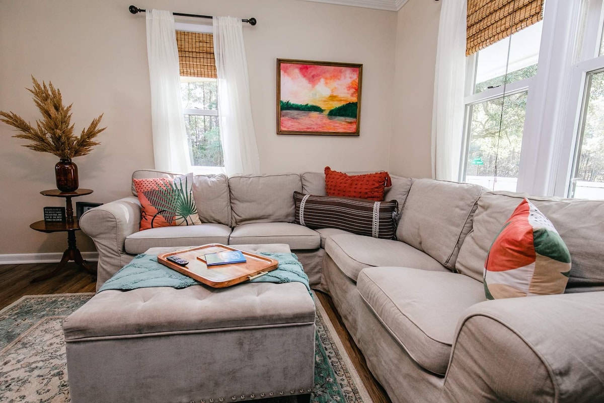 HOT $ RATES! 🏖️Come fall in love with OBX sunsets in our stylish coastal farmhouse with gourmet kitchen, spa-like bathrooms and plenty of room for the fam. Wake up with the Croatan sound in your bedroom. Savor your morning coffee or an afternoon glass of wine on our pier. Fish off the pier. Enjoy al fresco dinners with the sunset! Relax in a soaking tub or a waterfall shower with the view. Bring your dog, we have a big fenced yard!