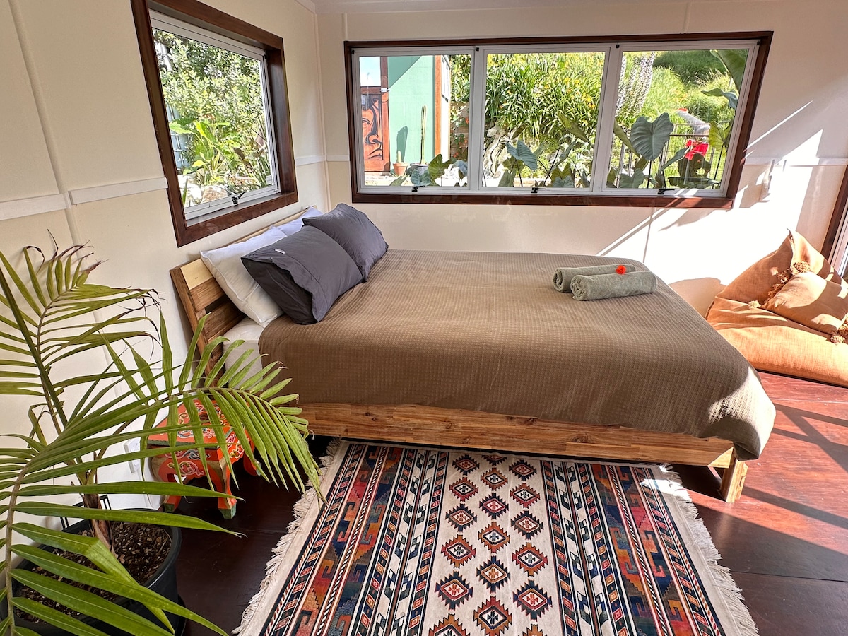 Sitting along the water, with the Raglan cafes, shops & nature walks only 50m from your doorstep, is our comfortable and beautiful 2-storied one-bedroom apartments. Upstairs you’ll find a spacious bedroom with a comfortable King bed & bi-fold windows looking out to the Pohutukawa trees & water. The setting is quite magical. Downstairs you’ll find an open plan kitchenette & stylish living area with comfy couch, day bed & bi-fold doors opening out to your own patio, and courtyard space.