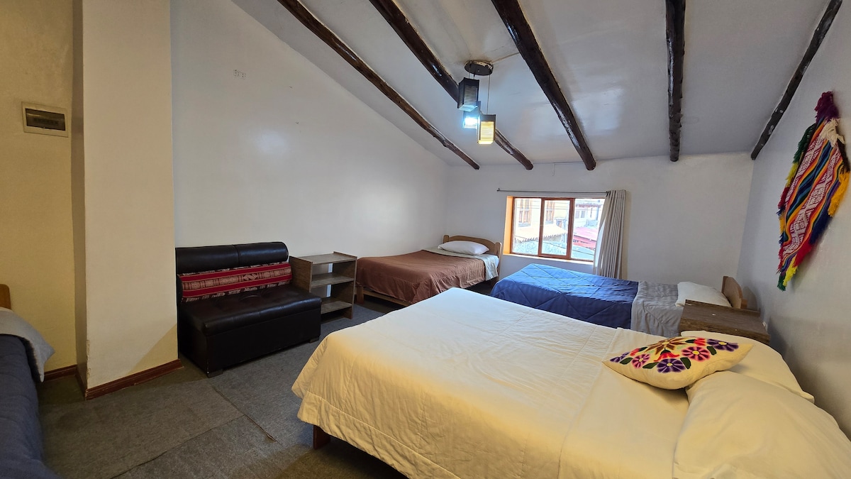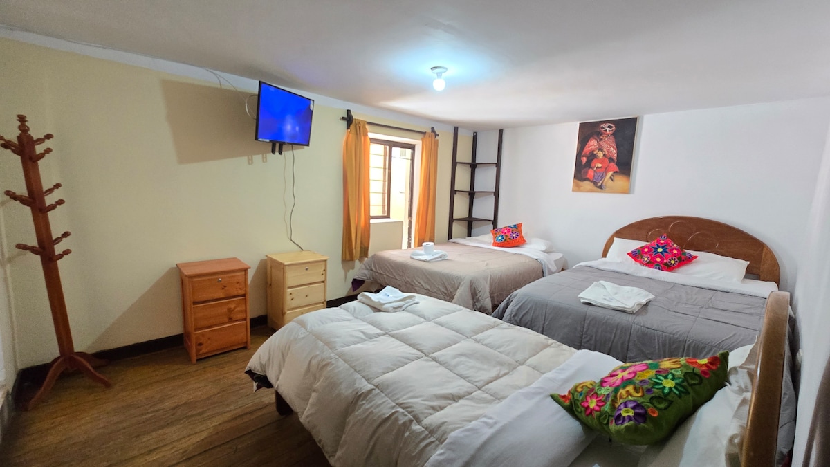 la ubicacion esta a 5 minutos de la plaza , rodeada de montañas y muy cerca del lugar principal , cuenta con espacios amplios , con vistas a las montañas y resto arqueologico . wife, ducha caliente