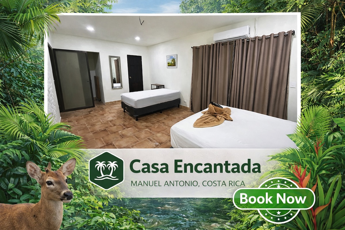Apartamento con Aire Acondicionado Tabaiba 3. Descubre la magia de la naturaleza en los apartamentos Tabaiba. La propiedad es de fácil acceso por ubicarse sobre la carretera a Manuel Antonio. Durante tu estancia podrás ver monos capuchino cara blanca y tití, iguanas, perezosos y una gran variedad de aves, árboles y plantas debido a su ubicación inmejorable. Todo hecho con mucho amor pensados para que puedas disfrutar de tu estancia en este paraíso terrenal.