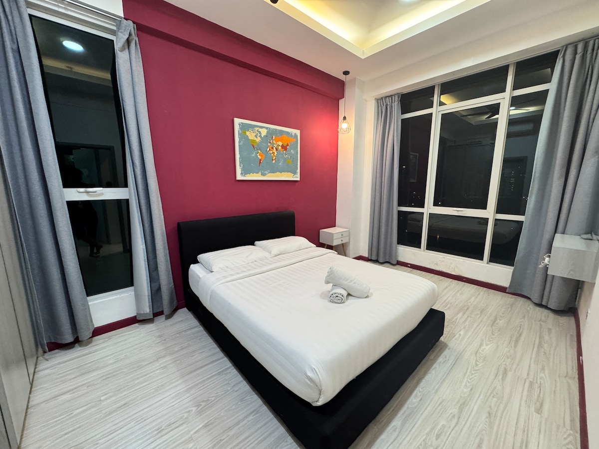 Stunning Sea view from the house. Chilling at the balcony. Swimming pool@level 6 Living Room, Queen Size bedroom, private sofa bed corner with curtains. Ensuite bathroom with hot and cold water shower. Large refrigerator with ice cube , mini kitchen with electric cooker, pot,plate,spoon,fork are available . Light cook at the kitchen. Filter water machine hot and warm. Please select 3 guest if you need single bed setting convert from sofa bed.