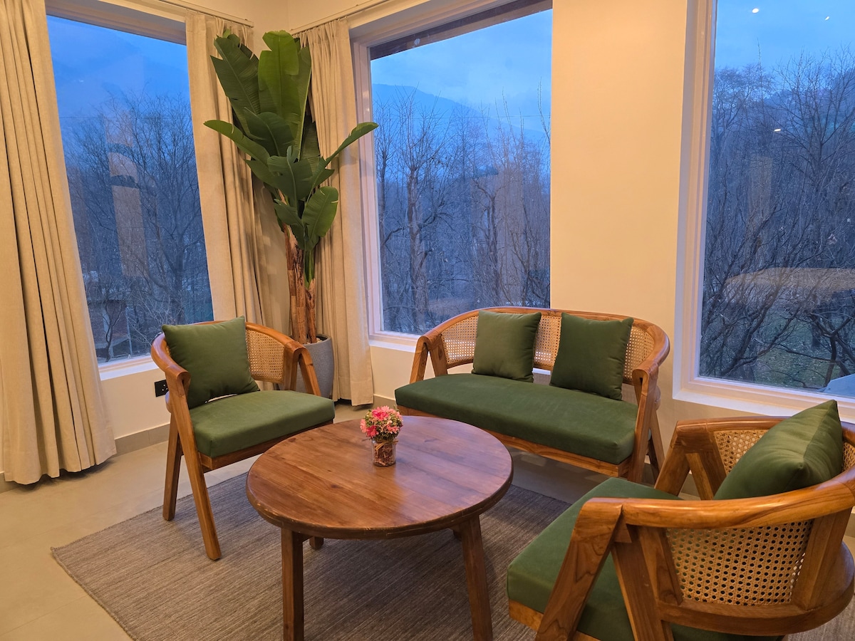 For those tired of following usual tourist trails & seeking out unique n less crowded destinations, Get yourself off the grid & indulge yourself in unforgetting experience @ our luxury 2-bedroom aptmnt that has got stunning aesthetics, offers unmatchable tranquility & opportunity to fully immerse oneself in the present moment. Situated at a height of 7500 ft, it offers breathtaking valley view with snow-dusted apple orchards, pine / deodar trees, sprawling mountain range & meandering beas river!