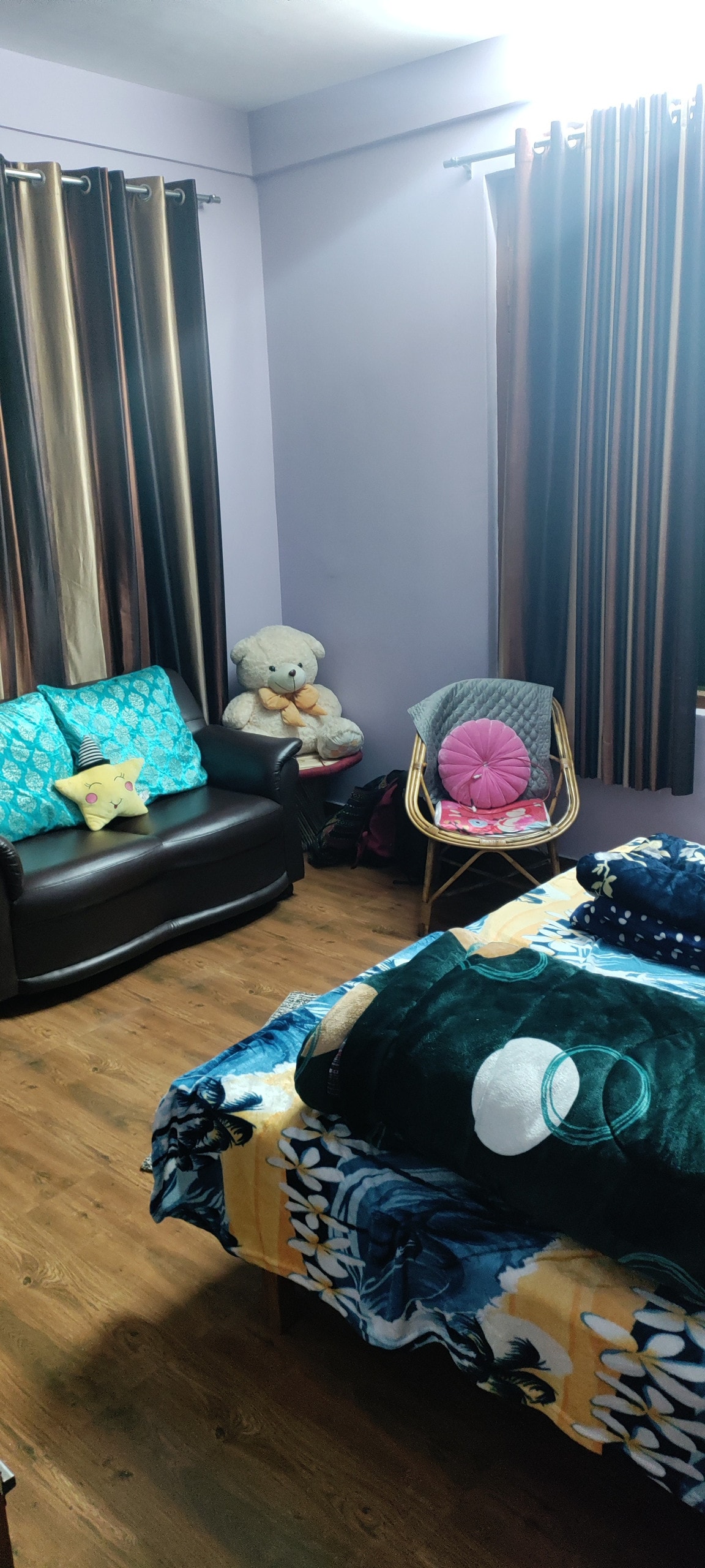 "A spacious 1 BHK, primarily set up for guests. Space is beautifully designed for guests looking for a weekend getaway or guests looking for long-term stays as well. It is within a walking distance of 5-10 minutes from the main market. This place also offers a beautiful view of the Kullu town from its roof. Along with a spacious living room, a working desk, well-equipped kitchenette, it has a cozy bedroom and an attached washroom. Wifi is also available. Parking is available as well."