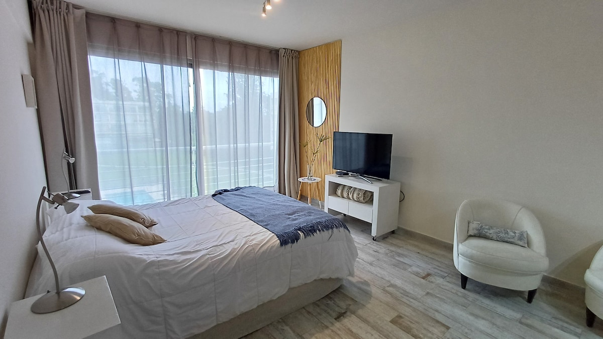 The residential complex Campus Vista has 24-7 private security, a sauna, a heated indoor pool, outdoor pool, fully equipped gym, fire pit, terrace with panoramic views, covered parking spot. It features: queen bed, sofa bed, spacious private terrace with a fire pit with a grill, a covered parking spot. Immerse yourself in a relaxing experience located in Pilar, in front of the Austral Campus and 300 meters from its entrance. It's an 8' walk or a 2' drive to the IAE and Hospital Austral.