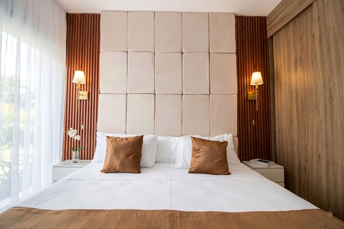Enjoy your stay in this comfortable and modern, brand-new apartment! Two bedrooms with air conditioning, comfortable beds and spacious closets. Living and dining room with air conditioning and a full kitchen. Common areas to enjoy: Children's pool and wading pool. 24/7 controlled access. Parking available for one car within the complex. 📍 The best location, close to supermarkets, restaurants, hospitals, 2 minutes from the fair and points of interest. TV and Wi-Fi
