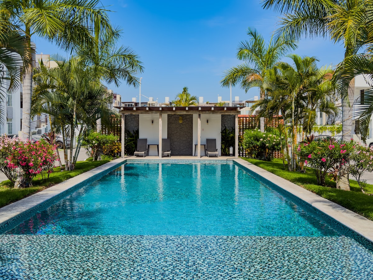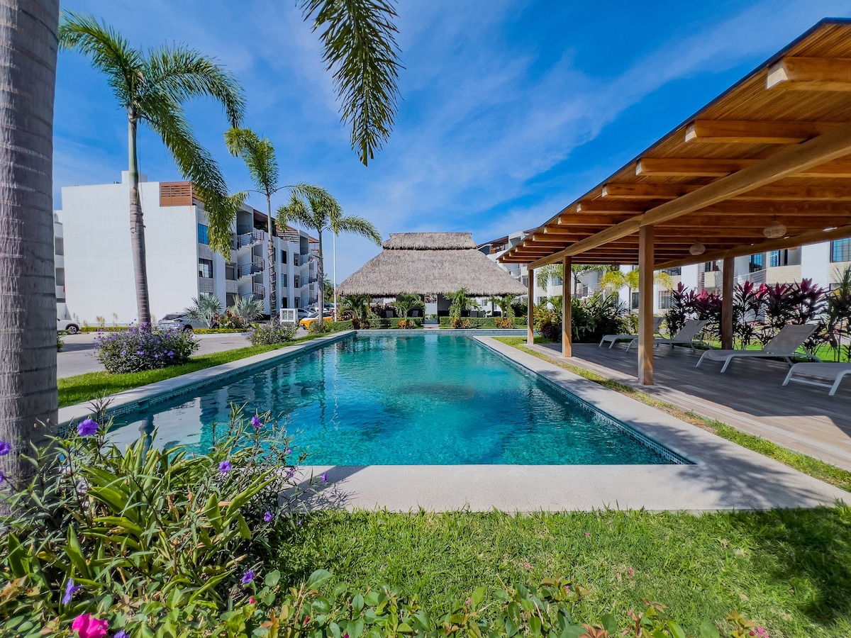 Relájate en este departamento vacacional único y tranquilo, diseñado para ofrecerte comodidad y descanso. Disfruta de una alberca privada templada dentro del alojamiento, de uso exclusivo, ideal para relajarte en cualquier momento. Cuenta con cocina totalmente equipada y espacios modernos pensados para tu confort. Además, como huésped tendrás acceso al club de playa del complejo, ubicado justo enfrente, a solo 2 minutos caminando.