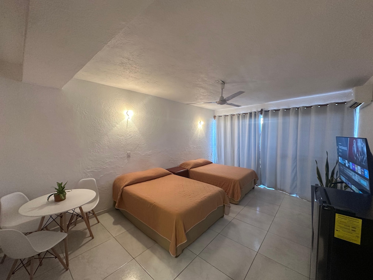 Departamento de 1 recamara para hasta 4 personas con A/C, por día, semana o mes. Cuenta con cocina, sala, comedor, televisión con cable, internet de alta velocidad ( fibra óptica) baño completo, está a solo 50 metros del acceso a la playa y cerca de restaurantes. Todos los servicios incluidos, también contamos con servicio de lavandería y renta de bicicletas. El dpto. Cuenta con una sombrilla para 2 personas y sillas para la playa 🏝️ No contamos con servicio de alberca.