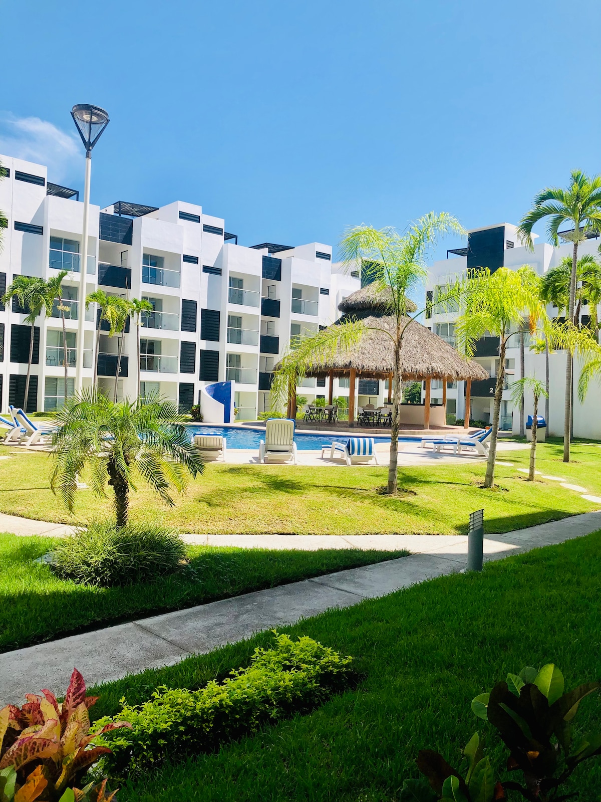 Bello departamento a unos pasos de la playa caminando,ubicado en complejo privado exclusivo suites las palmas se encuentra sobre el blvd principal de la zona turística y comercial de Manzanillo a costado de sams club Muy cercano de los bares, antros y restaurantes 5-3 minutos caminando 10 minutos caminado de plaza punta bahía en la que podrás disfrutar de cines, restaurantes,supermercados, 10 minutos de central de autobuses y 40 minutos del aeropuerto internacional de Manzanillo en auto