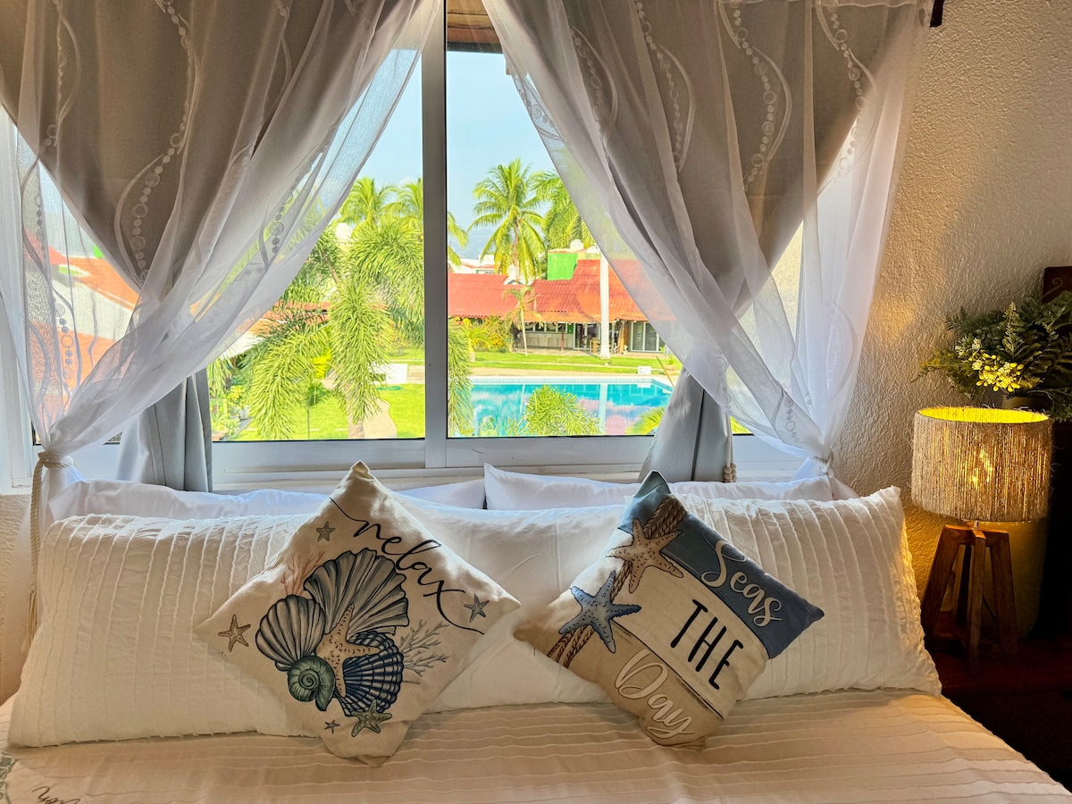 Relájate en villa Sandía III, donde la tranquilidad se respira! Amueblada y decorada con un toque mexicano. Tiene cómodas camas, con aire acondicionado, 3 TVs, servicio de internet, cocina integral, tina en recámara principal y lo mejor de todo: Con alberca y a unos cuantos pasos de la playa!! Hospédate sin tener necesidad de salir de club santiago! El condominio cuenta con todas las amenidades disponibles. Se barre y trapea todos los días sin costo adicional!