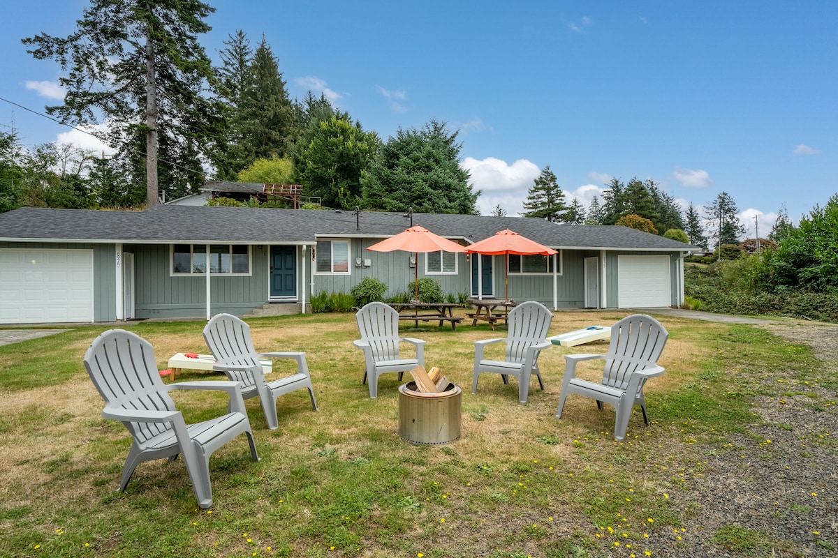 This house is perfectly perched on a hill, granting privacy and ocean view from almost every window. Lots of outdoor spots to relax in the sun. Hot tub, fire pit, lower and upper level decks for outside dinning and bbq. Fun bar swings. Enjoy the well appointed kitchen, chill in the living room with fireplace and view. Two desks with views and wifi. 65" roku tv in downstairs family room with pull out couch. Fenced and gated. Well above tsunami risk. 4 paved parking spots.