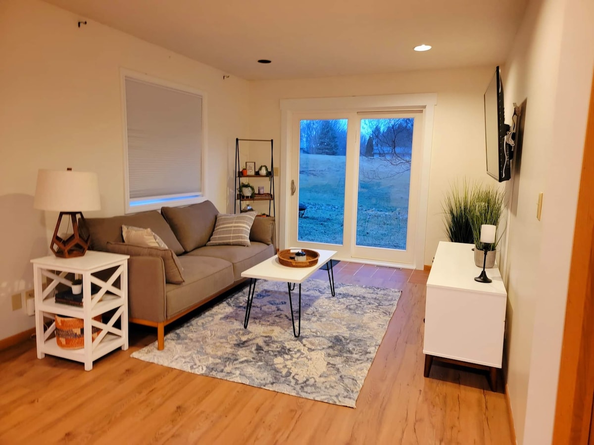 Modern, Spacious. Independent Guest Suite separate from host, with its own private entrance. Host compliant:Air BnB COVID 19 cleaning safety practices, social distancing. Native prairie, wildlife. 6 large windows in Guest Suite living room. Great kitchen, lrg bedroom: Queen, firm bed. Gazebo. Vacation. Retreat space. Prof'l. College search. Moving. Shopping, restaurants, groceries: five minute drive/bike ride! Amazing area: 'Rail to trail' bike routes, pools, lakes, kayaking, entertainment.