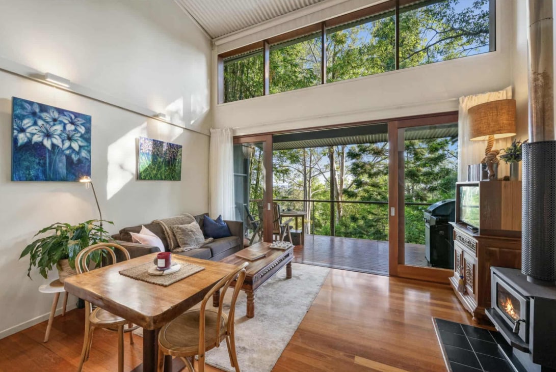 Nestled in the scenic Maleny hills, air-conditioned Magnolia Cottage blends modern comfort with country charm. Surrounded by lush gardens, the cottage boasts timber details, high ceilings, and expansive windows with breathtaking views. The cozy living area, framed by a bay window and French doors, invites relaxation. The two bedrooms include a queen, double, and single bed, plus a country-style bathroom. This retreat provides both comfort and privacy. Book your perfect country escape today!