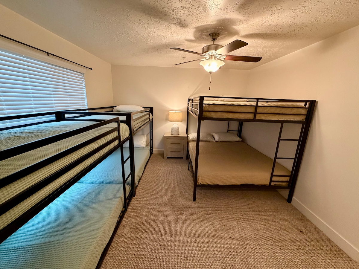 私人舒适地下室,配备2张加大双人床和2张标准双人床