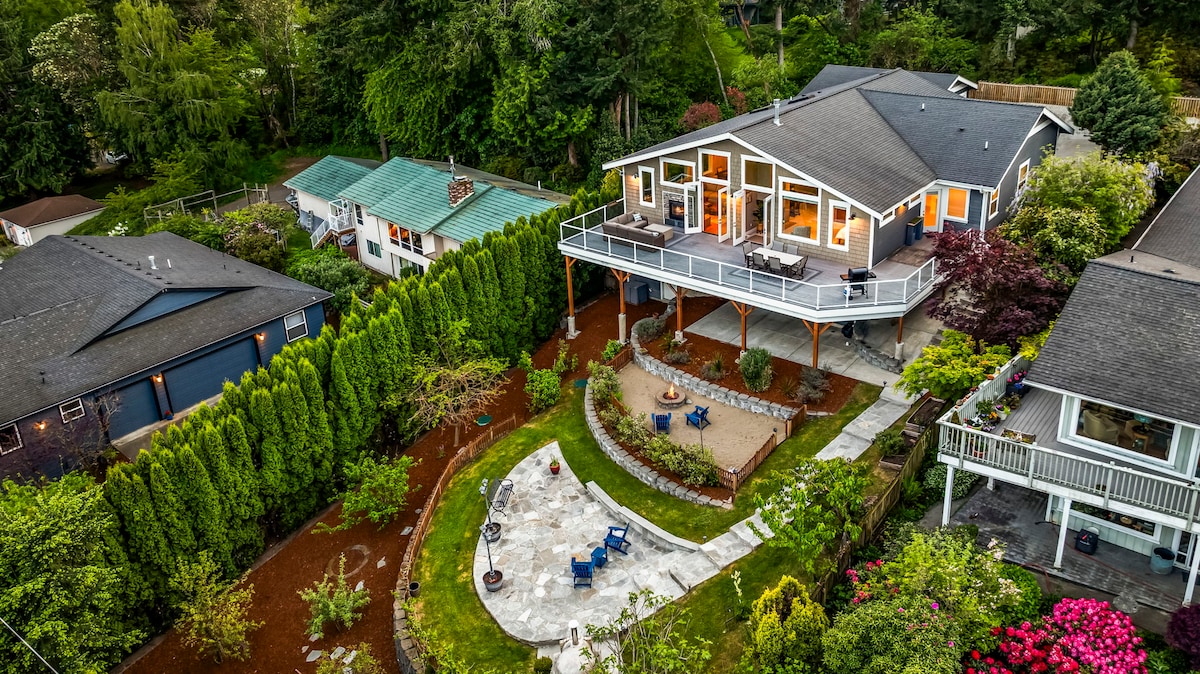 Welcome to the Eagle's Lookout Lodge in Gig Harbor! Nestled on almost an acre of spectacular wooded waterfront, this beautiful retreat offers you the serenity of the Pacific Northwest experience with showstopping panoramic views! Relax in the hot tub or around the firepit and watch for eagles from the expansive deck overlooking the water! Enjoy beach access just a short hike down a private trail, featuring a breathtaking dock and provided kayaks. Just 10 minutes away from Downtown Gig Harbor!