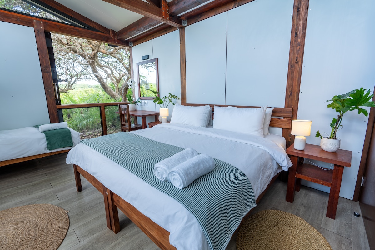 These chalets sleep 5 and have 2 bedrooms. The 1st bedroom has a king bed and the 2nd bedroom has 2 single beds. The bathroom has an outdoor shower. Each chalet has an open-plan kitchen, dining and living area with sofa bed, and outdoor braai fire pit.