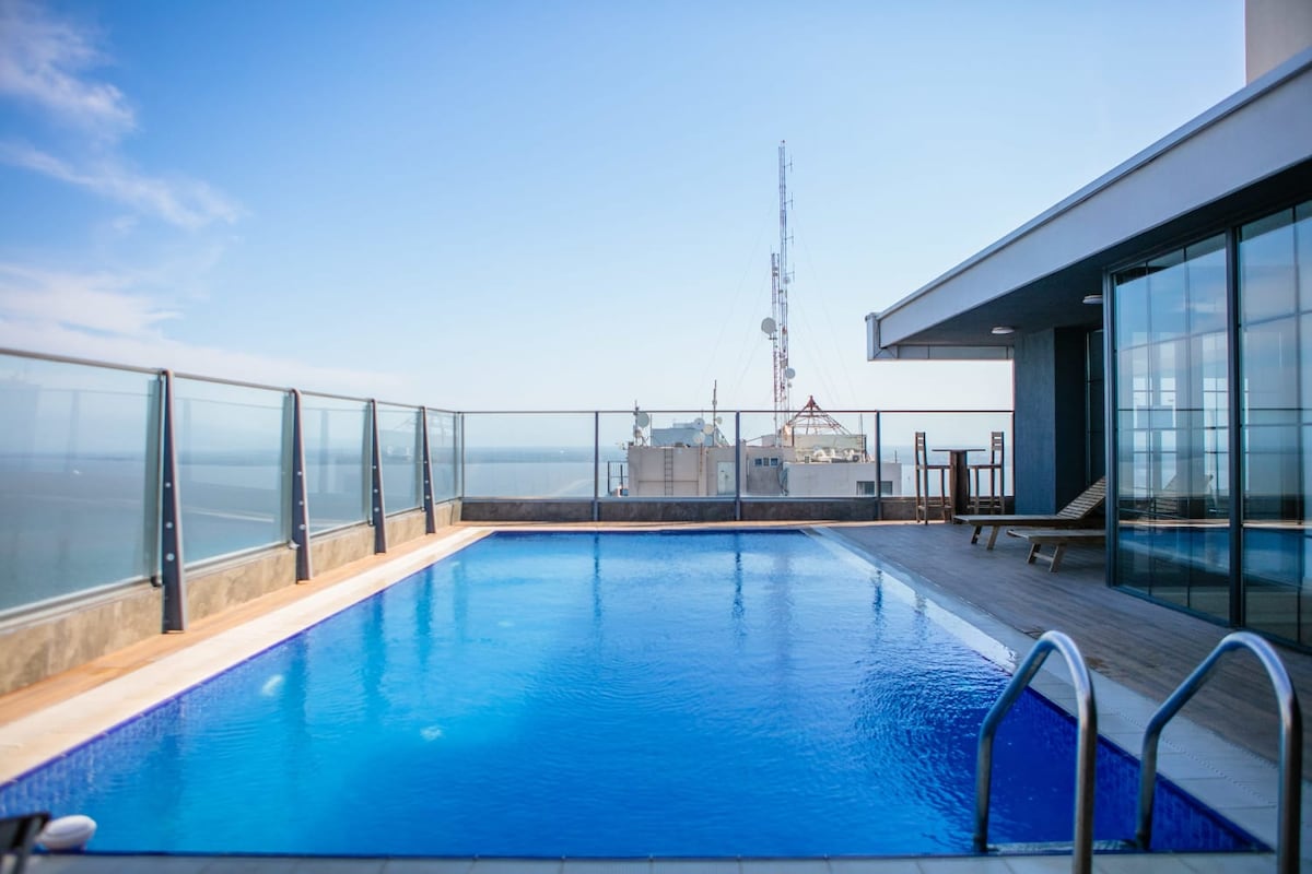The apartment is located in the center of the city with all the services needed with the same building (pharmacy, market, barbershop, Liquor shop, restaurant, etc). The build too have a private swimming pool and a gym free to use. Theres a generator and big water tanks so theres never a lack of water or energy in the apartment. Theres too a parking space included in a close garage with security. Cleaning lady included.