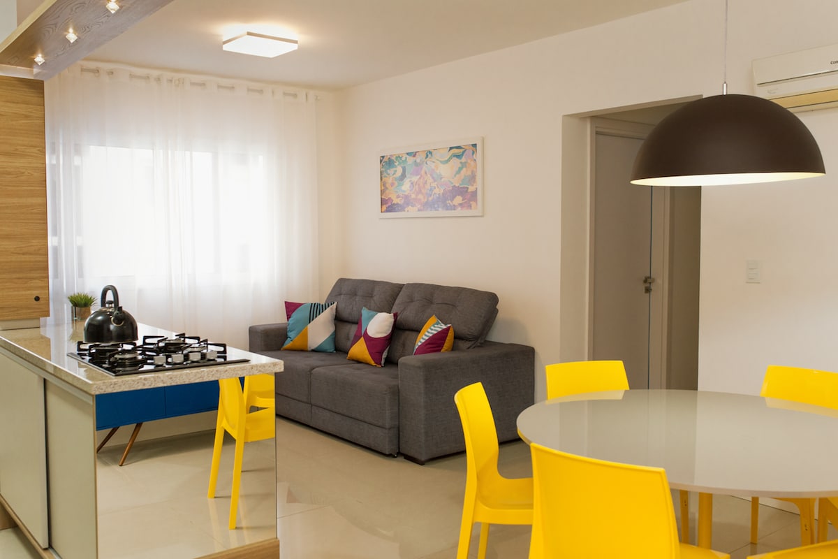 Ao lado do Ramblas by Roubadinhas, onde encontramos a melhor variedade de restaurantes do litoral e mix de lojas. Apartamento completo, com cama de casal e sofá cama, internet e tv com BTV, com acesso à todos canais e uma imensa variedade de filmes e séries, em um condomínio resort, contendo piscina e piscina aquecida, sauna, salão de festas, sala de jogos, academia, brinquedoteca. No apartamento a voltagem é 220v e tem: Secador de cabelo; Ferro de passar roupas; Shampoo, condicionador, sabonet