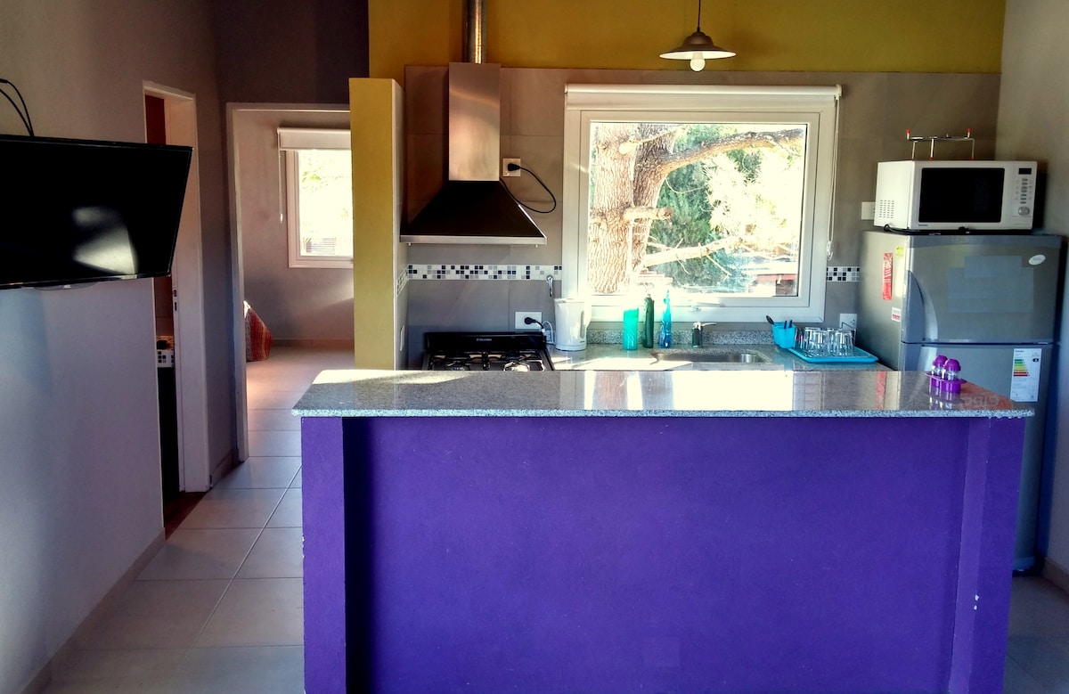 Relajate en este alojamiento único y tranquilo. Esta moderna unidad de diseño de entrada independiente con cerradura Smart, se destaca por sus ventanales de alta prestación con hermosas vistas al bosque y por su amplia y completa cocina de detalles de categoría gourmet con gran isla de silestone para sentarse a desayunar en sus banquetas de estilo mirando al bosque a tu ritmo. Dejamos una bandeja de bienvenida al check in.