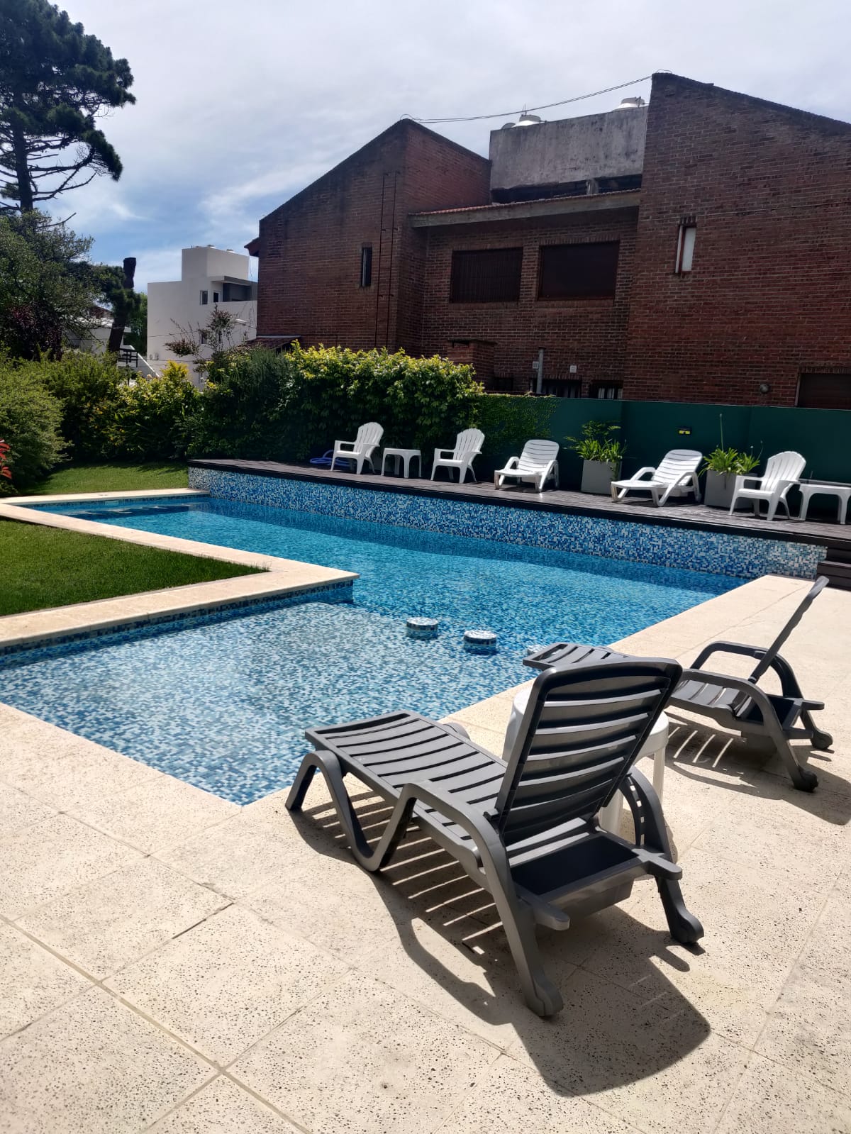 Hermoso departamento de 2 ambientes de 44.35m2 cubiertos y un patio de 36m2, que tiene como vista la pileta del edificio y un pinar divino. Cuenta con una cochera cubierta grande para camioneta. Un lugar que mezcla la naturaleza, la comodidad y el confort. Cuenta con un baño completo, un dormitorio, un living con cocina incorporada (heladera, microondas, horno) y un sillón que se hace cama doble o pueden ser 2 camas individuales. Tiene parrilla propia y techada.