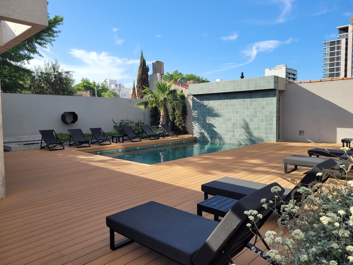 Disfrutá de una experiencia con estilo en este alojamiento a metros del Torreon del Monje. Ambiente calido.Cocina integrada con barra desayunadora.Cama matrimonial,TV 43',Wifi,escritorio,aire acondicionado frio/calor. Baño con mampara.