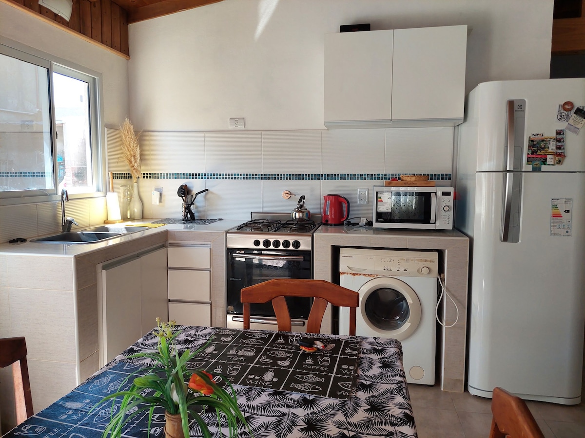Casa de dos ambientes, para cuatro personas. Equipamientos: -Dormitorio con una cama de dos plazas. -Cocina comedor con 2 camas individuales. -Baño y cocina equipada. Microhondas. -Servicio de WIFI. -Parque independiente con parrilla. -Trotadora para entrada de hasta tres autos. Ubicación: Entorno residencial, a dos cuadras del acceso de las playas del sur. 1km del Bosque. 4km del centro comercial del puerto. 400mt centro comercial. Acceso a lineas de colectivo. :)