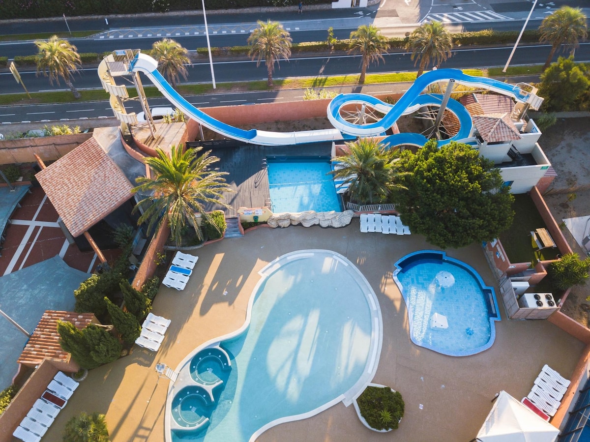 Ce camping de haute qualité est idéalement situé (plage, étang, commerces, centre de thalasso) comporte boulangerie, supérette, restaurants, coiffeur,docteur.Vue sur l’étang avec ses flamants roses et sur le mont Canigou,à 30 mn de l’Espagne,10 mn de la gare,de l’aéroport de Perpignan.De nombreuses activités, le club enfants 1-15 ans .Il a son parc aquatique piscine chauffée couverte, toboggans pistes de glisse,pataugeoire,SPA, splash, terrains pétanque ping-pong salle de sport aires de jeux.