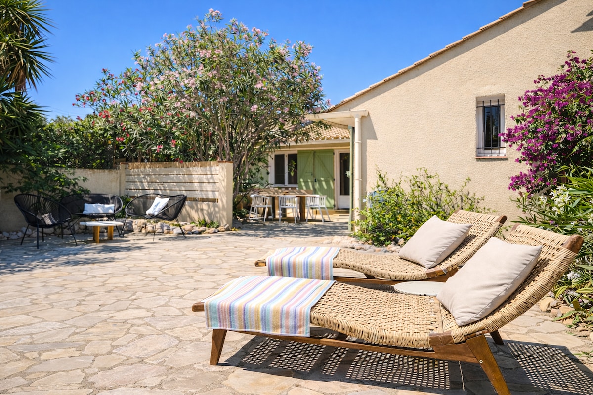 La maison se trouve à seulement 2 min à pied la plage, immense bande de sable fin de 9 km, idéale pour les balades, baignades et instants de détente face à la Méditerranée Vous allez adorer : • Grand jardin privé avec arbres fruitiers, transats, coin repas ombragé • Intérieur apaisant lumineux • Climatisation • Un niveau • Parking sur place • Animaux bienvenus • Tout à pied : plage, restos, marchés • Cuisine neuve, moderne Une maison rénovée avec soin, pensée pour notre famille