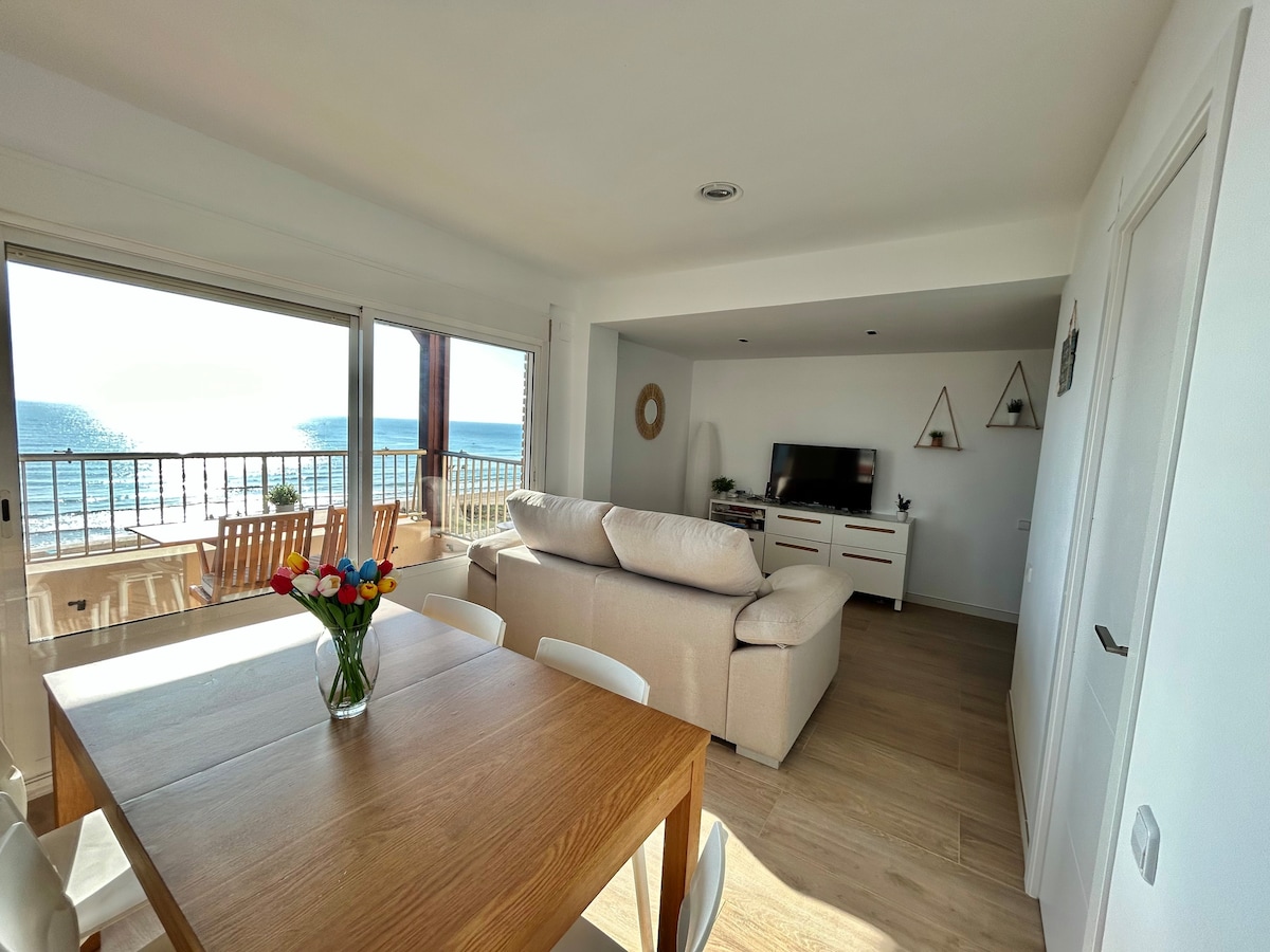 Apartamento TOTALMENTE REFORMADO CON FABULOSAS VISTAS AL MAR EN PRIMERA LINEA DE LA PLAYA DE LLASTRA. Compuesto de 2 habitaciones , una con cama de matrimonio y otra con una litera doble, para 5 personas, salón comedor amplio con mesa de hasta 6 comensales viendo el mar, aparcamiento privado, Wifi , 2 Smart tv, aire acondicionado con bomba de calor y ventiladores de techo, cocina (lavadora, combi, inducción , horno grill, microondas, exprimidor, calienta agua. cafetera Dolce Gusto), 2 baños.