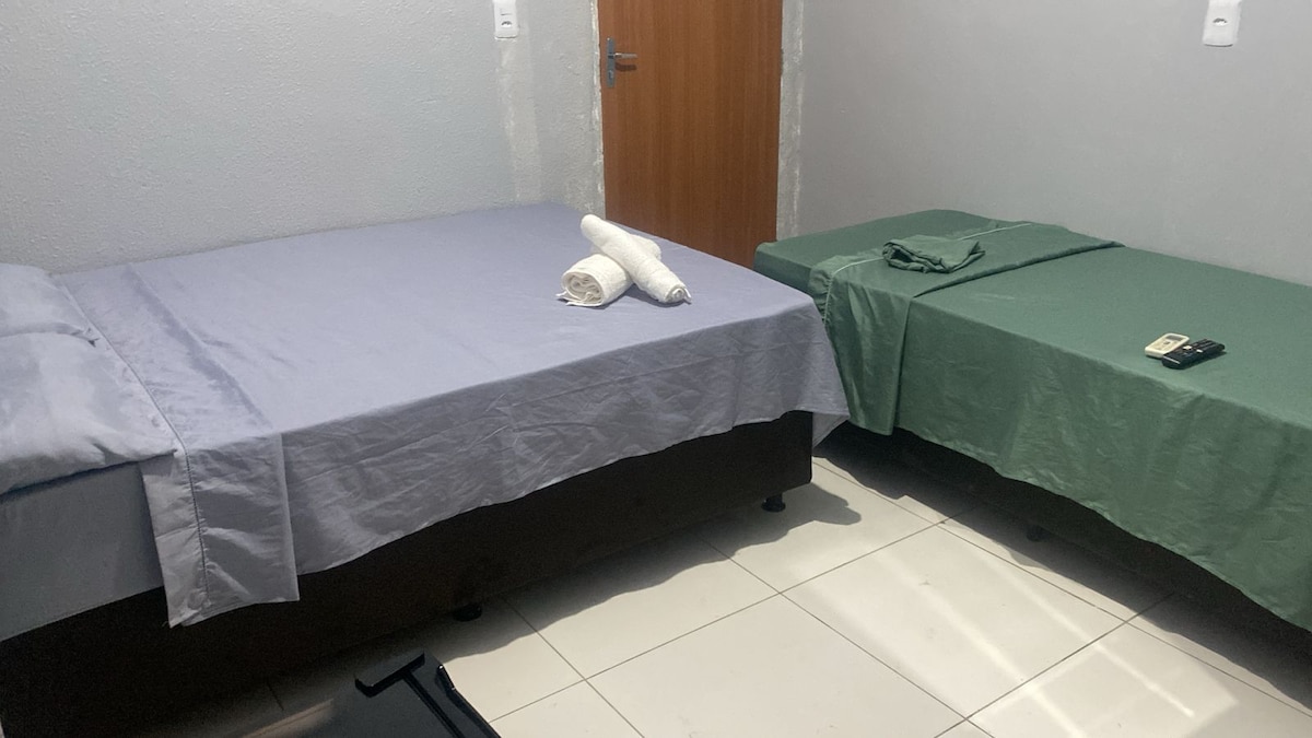 Acomodação tranquila com garagem coberta , sala, cozinha, dois quartos, três camas de solteiro e uma de casal, área para lavar roupas, central de ar nos dois quartos, ventilador, dois banheiros, Wifi, utensílios básicos de cozinha (Panelas, copos, talheres, vasilhas, xícaras, liquidificador, sanduicheira, coador de café)