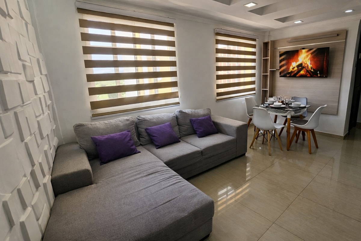 Desde este acogedor alojamiento céntrico, el grupo podrá tener fácil acceso a todo (Cerca de Restaurantes, Gasolineras, Clínicas, Supermercados y Farmacias), el departamento es espacioso, cuenta con todo su equipamiento totalmente nuevo (Wifi, Camas, Smart Tv, Lavadora, Cocina, Nevera, Aire Acondicionado, AirFryer), todos sus servicios (Agua, Gas y Electricidad) 24 horas, 1 puesto fijo de estacionamiento + 3 puestos para visitantes, El edificio cuenta con ascensor y vigilancia nocturna