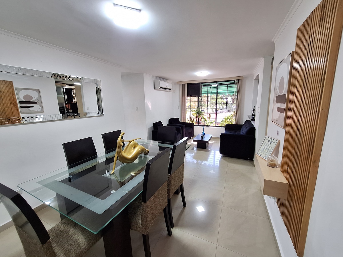 Apartamento familiar muy acogedor, ubicado cerca de centros comerciales, farmacia y supermercados. Completamente amoblado y equipado. Tiene lo que necesitas para una estadía confortable y sentirte como en casa. Cuenta con todos los servicios: internet de alta velocidad por fibra óptica, Smart tv, aire acondicionado en todas las habitaciones, vigilancia las 24 horas, un puesto de estacionamiento y áreas verdes.