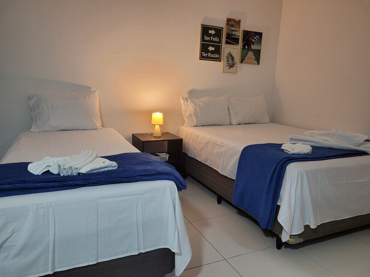 Apartamento mobiliado, com três suítes, forneço roupas de cama e banho . Quartos equipados com ar condicionado . TV com Netflix, IPTV, You tube, internet em todo local. Cozinha equipada com fogão, geladeira, microondas, liquidificador e utensílios. Garagem coberta e privada para um carro. Terraço compartilhado comigo e ou outros hóspedes da unidade ao lado.